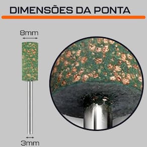 Ponta Montada Cilíndrica 8mm Borracha Abrasiva Gergelim Haste 3mm para Micro Retifica Dremax - Marca: Dremax - Referência: PM084 - Diâmetro da cabeça: 8mm - Diâmetro da haste: 3mm - Gramatura: Grão 180 - Material da ponta: Borracha Abrasiva Gergelim - Material da haste: aço inox - Pontas montadas de borracha Flexível, para retificação e polimento precisos - Uso em micro retíficas e mini lixadeiras de qualquer marca com mandril de 3mm - Seu formato facilita o trabalho em locais de difícil acesso - Indicado para desbaste, semi-acabamento e polimento, dependendo do material - Pontas montadas de borracha com abrasivos são maleáveis, porém com alto pode de desbaste devido os seus abrasivos - Seu formato facilita o trabalho em locais de difícil acesso - Garantia: 90 dias contra defeitos de fabricação A DREMAX é a primeira e única marca brasileira dedicada exclusivamente às micro retíficas, acessórios e acoplamentos para esta indispensável ferramenta. Seja para trabalhos de precisão, artesanato, modelagem ou reparos, a DREMAX tem o produto certo para você. Marca: Dremax Ean: 7734625984911