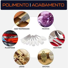 - Para polir metais e plásticos em superfícies planas ou orifícios