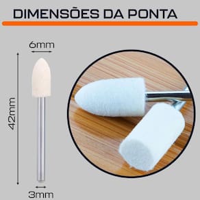 Ponta Montada de Feltro 6mm Cônica com Haste 3mm para Polimento com Micro Retíficas Dremax - Marca: Dremax - Referência: PM078 - Diâmetro da Ponta: 6mm - Comprimento: 42mm - Diâmetro da haste das pontas: 3mm - Indicado para polimentos - Formato: Cônica tipo bala - Uso em micro retíficas de qualquer marca que suporte prender hastes de 3mm - Para polir metais e plásticos em superfícies planas ou orifícios - Indicada para polimento de metais ferrosos ou não ferrosos, aço, aço inoxidável, alumínio, bronze, cobre, latão e plástico em geral - Garantia: 90 dias contra defeitos de fabricação A DREMAX é a primeira e única marca brasileira dedicada exclusivamente às micro retíficas, acessórios e acoplamentos para esta indispensável ferramenta. Seja para trabalhos de precisão, artesanato, modelagem ou reparos, a DREMAX tem o produto certo para você. Marca: Dremax