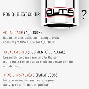 As ponteiras esportivas outs são fabricadas totalmente em aço inox 304 e recebem um polimento especial. Isso garante um produto de qualidade e brilho incomparável que nunca irá oxidar e nem descascar, melhorando o visual do seu veículo por muito mais tempo