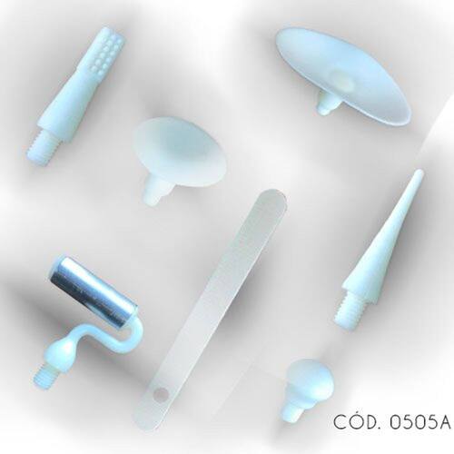 Contém: 1 (uma) unidade da Ponteira Proprioceptiva Côncava Orofacial, 1 (uma) unidade da Ponteira Proprioceptiva Plana Facial e Cervical, 1 (uma) unidade da Ponteira Proprioceptiva Pontos Articulatórios, 1 (uma) unidade da Ponteira Proprioceptiva Intraoral, 1 (uma) unidade da Ponteira Proprioceptiva Dores Localizadas, 1 (uma) unidade da Ponteira Proprioceptiva Estimulação Fria, e 1 (uma) unidade da Ponteira Proprioceptiva Espátula Plástica Pró-Fono.