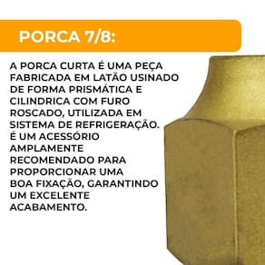 A porca curta 7/8 SAE para tubo de cobre é uma peça fabricada em latão usinado de forma prismática e cilíndrica com furo roscado.