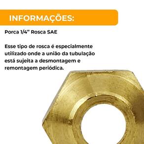 A porca curta 1/4 SAE para tubo de cobre é uma peça fabricada em latão usinado de forma prismática e cilíndrica com furo roscado. Utilizada em conexões do sistema de refrigeração em geral. Confere maior resistência mecânica e muito mais resistente a trincas proveniente dos esforços de torção em relação a similares usinadas.