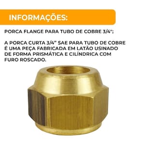 A porca curta 3/4 SAE para tubo de cobre é uma peça fabricada em latão usinado de forma prismática e cilíndrica com furo roscado. Utilizada em conexões do sistema de refrigeração em geral. Confere maior resistência mecânica e muito mais resistente a trincas proveniente dos esforços de torção em relação a similares usinadas. É um acessório amplamente recomendado para proporcionar uma boa fixação, garantindo um excelente acabamento.