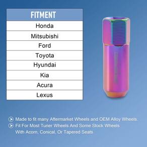 Substituição para Honda, substituição para Mitsubishi, substituição para Ford, substituição para Toyota, substituição para Hyundai, substituição para Kia, substituição para Acura, substituição para Lexus e outras marcas de carros. Descrição: - Condição: 100% novo - Materiais: Feito de alumínio leve de alta qualidade - Cor: igual à imagem Neo Chrome - Peso líquido das nozes: aproximadamente 30 g - Rosqueado para 12 x 1,5 mm - As hastes pesam 30 gramas cada. - Assento de estilo cônico de 60 graus. - 60 mm de comprimento e 20 mm de largura. - Instalação com soquete de 19 mm (não incluído). - O design fino elimina a necessidade de lugnuts de acionamento estriado. - Verifique o tamanho das porcas em suas rodas antes de comprar. - Instruções de instalação não incluídas, a instalação profissional é altamente recomendada. - Feito para caber em muitas rodas de reposição e rodas de liga leve. Substituição para a maioria das rodas afinadoras e algumas rodas de estoque com assentos de bolota, cônicos ou cônicos. Substituição para Honda, substituição para Mitsubishi, substituição para Ford, substituição para Toyota, substituição para Hyundai, substituição para Kia, substituição para Acura, substituição para Lexus e outras marcas de carros. - Feito de alumínio aeronáutico T6068 usinado CNC de alta qualidade. - Passo de teto M12 x 1,5 mm - 20 peças e comprimento de 60 mm - Design aberto, ótimo com suas rodas de reposição. - Verifique as especificações/tamanho da rosca do padrão do pino do seu veículo antes de comprar.