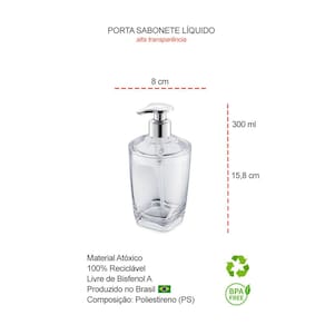 Porta Alcool em gel translucido. O Dispenser para Sabonete Liquido ou alcool em gel possui transparência que valoriza o conteúdo interno, facilitando a sua identificação. Fabricado em poliestireno com a qualidade e beleza que valoriza seu banheiro. Alta transparência, material 100% reciclável, atóxico e livres de Bisfenol A (BPA Free).