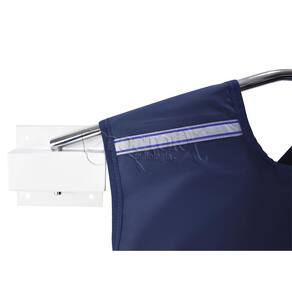 Porta avental para ser fixado à parede do tipo cabide basculante para acomodar até 2 aventais de cinza, com suporte construído em aço tratado e pintado e cabides basculantes em aço cromado. aventais não inclusos
