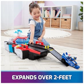 O QG do porta aviões PAW Patrol é um brinquedo transformador que proporciona emocionantes missões de resgate em mares falsos. Ele vem com uma figura de ação genuína da Patrulha Canina The Mighty Movie Chase e um autêntico veículo de resgate de carro de polícia do Chases O QG do porta aviões se transforma de 66 cm de comprimento e 35 cm de largura, até 93 cm de comprimento e 43 cm de largura quando entra no modo de resgate.