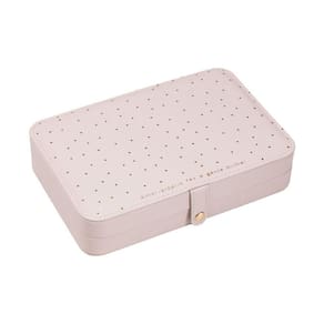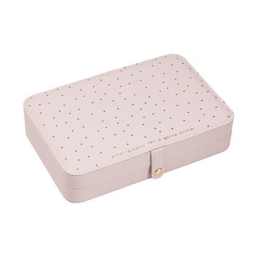 Todo em off-white, em sua parte externa, ele traz uma delicada estampa poá na cor dourada. Já sua parte interior é toda revestida em veludo e conta com: