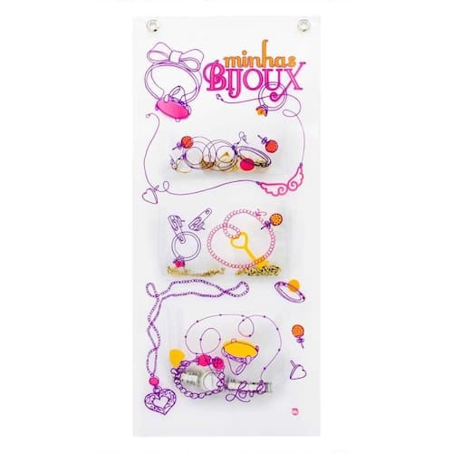 Fabricado em PVC transparente este mural vem com 3 bolsos em tamanhos diferentes para você guardar suas bijoux, maquiagens e acessórios. Contém ilhós e dupla face para você colocar aonde quiser.