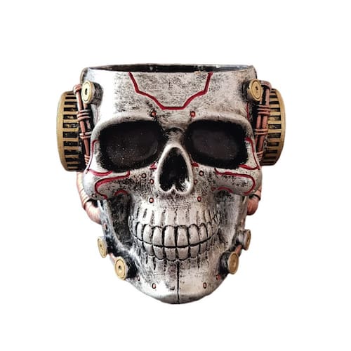 Material: resina Tamanho: 11,5* 13* 10 cm Peso: 270 g Design de caveira Cyberpunk: atraente porta-canetas em forma de caveira mecânica com engrenagens e fios detalhados, perfeito para mesas góticas, steampunk ou inspiradas no Halloween. Armazenamento multifuncional: funciona como porta-canetas, porta-lápis ou pote para canetas e também pode armazenar pincéis de maquiagem, réguas, tesouras ou pequenas ferramentas de escritório. Material de resina durável: feito de resina de alta qualidade, garantindo durabilidade, estabilidade e um impressionante acabamento metálico que se destaca em qualquer mesa. Organizador de mesa: mantém as canetas e os acessórios organizados, além de servir como um toque decorativo arrojado para escritórios, estudos ou espaços criativos pessoais. Decoração versátil: ideal para temas de Halloween, interiores góticos ou coleções de estilo steampunk, combinando utilidade com apelo artístico.