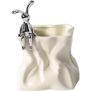 Material: cerâmica Tamanho: 9,5* 9,5* 16,5 cm Peso: 900 g Construção cerâmica elegante: feita de cerâmica premium com acabamento liso, oferecendo durabilidade e uma estética refinada. Textura ondulada exclusiva: apresenta uma superfície ondulada esculpida que adiciona uma sensação de movimento e estilo artístico à decoração de sua mesa ou sala de estar. Silver Bunny Accent: A figura decorativa de coelho em tom cromado empoleirada na borda cria uma aparência divertida e sofisticada. Organizador multiuso: perfeito para guardar canetas, lápis, pincéis de maquiagem ou pequenas ferramentas; também adequado como suporte de controle remoto. Posicionamento versátil: ideal para mesas de escritório, salas de estudo, penteadeiras ou mesas de café, aprimorando a praticidade e o apelo do design moderno.