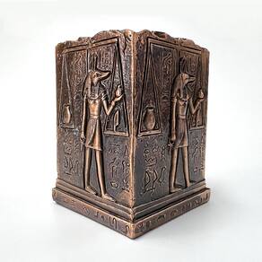 Material: Resina Tamanho: 6* 6* 9 cm Peso: 225 g Design egípcio antigo — apresenta esculturas inspiradas em anúbis e hieróglifos, trazendo uma estética egípcia misteriosa e vintage para qualquer mesa. Material de resina durável — Feito de resina de alta qualidade com acabamento em bronze antigo, resistente e duradouro para o uso diário. Compacto e prático — tamanho 6x6x9cm, leve com 225 g, ideal para organizar canetas, lápis, pincéis de maquiagem ou pequenas ferramentas. Organizador multiuso — funciona como um pote para canetas, porta-lápis ou recipiente para pincéis cosméticos enquanto serve como peça decorativa de mesa. Perfeito para decoração de escritório e casa — Adequado para mesas, salas de estudo ou penteadeiras, combinando armazenamento com estilo cultural e artístico.