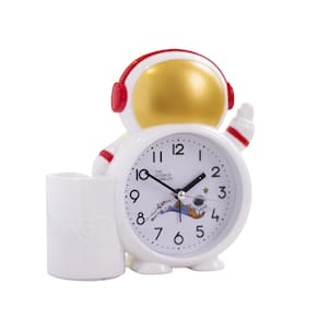 Material: plástico Tamanho: 14* 5,2* 14,5 cm Peso: 300 g Design divertido de astronauta: este adorável despertador para astronautas apresenta um design encantador de explorador espacial com um capacete dourado brilhante, tornando-o uma adição empolgante à mesa de qualquer criança ou estudante. Porta-canetas multifuncional: não é apenas um despertador, este relógio com tema espacial também funciona como um porta-canetas, ajudando a manter seu espaço de trabalho arrumado e organizado, ao mesmo tempo em que adiciona um toque divertido. Silencioso e sem tique-taque: projetado para um sono tranquilo, este relógio funciona silenciosamente sem nenhum som de tique-taque, perfeito para quem dorme pouco ou para quem prefere um ambiente silencioso. Construção em plástico durável: Feito de plástico resistente, este relógio foi construído para durar e suportar o uso diário, tornando-o uma escolha confiável e segura para quartos ou dormitórios infantis. Perfeito para crianças e estudantes: com seu design divertido e envolvente, este relógio ajuda crianças e estudantes a cumprirem o cronograma enquanto adiciona um elemento decorativo divertido ao quarto ou espaço de estudo.