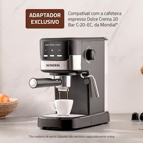 - COMPATÍVEL COM A CAFETEIRA ESPESSO C-20-EC: O adaptador* de cápsulas NESPRESSO é compatível com a Cafeteira Espresso Dolce Crema 20 Bar, C-20-EC, da Mondial. Desfrute de um café premium com a praticidade da cafeteira espresso na sua casa! *Os modelos de porta cápsula são vendidos separadamente online.