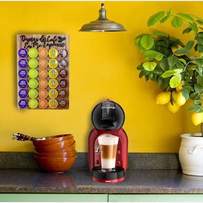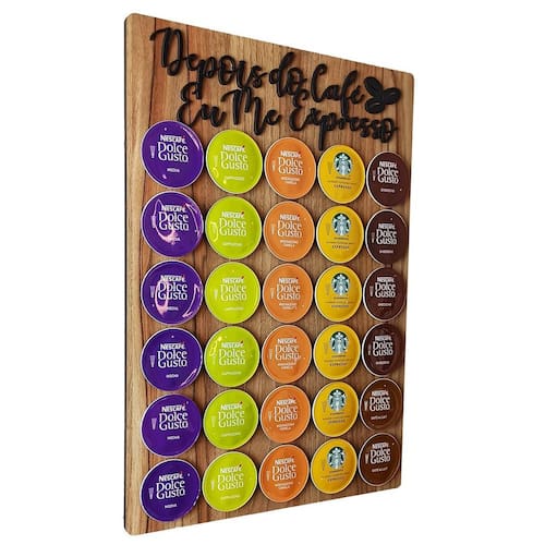 Nada como tomar aquele café expresso feito na hora é E ainda mais poder escolher de forma prática seu sabor predileto, já pensou Pensando nisso trazemos aqui para você nosso exclusivo e moderno porta cápsulas para cafeteira DOLCE GUSTO. Um produto para quem gosta de organização e praticidade, pois com ele você organiza suas cápsulas e ainda por cima decora seu cantinho do café, deixando-o ainda mais agradável Uma peça com design moderno feita em MDF bi-laminado da Altíssima Qualidade e acabamento impecável. As frases confeccionadas neste porta cápsulas são feitas em alto relevo com corte a laser, que faz com que a peça tenha um requinte especial e diferenciado no mercado.