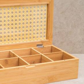 Porta chá de bambu Palhinha 8 divisórias da OIKOS.Ideal para guardar chás, especiarias para gin, acompanhamentos para a hora do cafezinho, doces, bijuterias e maisCom 8 divisórias que permitem separar e organizar melhor os objetos.O detalhe da palha e a cor natural são atemporais e combinam com diversos estilos de decoração, deixando o ambiente mais charmoso e rústico.Feita de bambu, material leve e ecologicamente correto.O bambu é resistente e tem propriedades que evitam a proliferação de bactérias, só precisa lavar e secar de acordo com as recomendações. Possui 2 imãs para melhor fechar a tampa. Características do Produto:Material: bambu, Acrílico e PalhinhaDimensões: 32 comp x16,5 larg x 7,5 prof