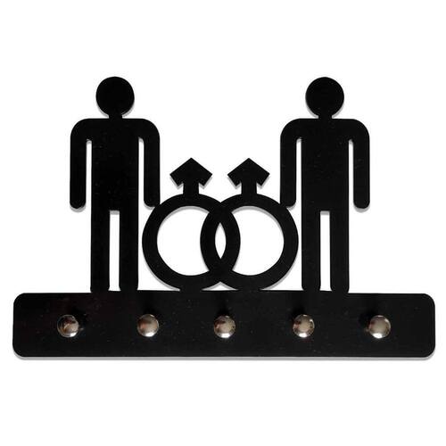 Porta Chaves Casal Homem e Homem Decoração Criativa Cor: Preto O Porta Chaves Casal Homem e Homem é excelente para uma decoração criativa e divertida.Você é criativo a até na hora de organizar as suas chaves.Características:Possui 5 pinos para chaves; Dimensões: 19,513 cm; Material: feito de PSI 2mm, material semelhante a acrílico, cortado a laser.Conservação: Pano macio úmido com água e sabão neutro Fixação: Adesivo dupla face para aplicação em qualquer tipo de superfície lisa. Acompanha fita dupla face para fixação à parede. Marca: Geek Vip