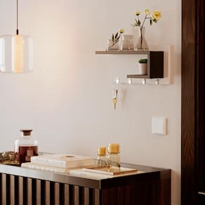 O produto possui 4 ganchos para pendurar chaves e espaço para guardar objetos pessoais e decorativos, tornando-o um produto versátil e prático para o uso no dia a dia.