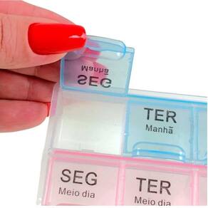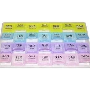 Você nunca mais vai esquecer de tomar seus remédios. Indispensável para quem faz uso contínuo e diário de medicamentos. Este porta medicamentos, vai facilitar sua vida e deixar tudo muito mais prático e organizado. Porta medicamentos com 4 compartimentos diários: Manhã, Tarde, Noite e Adicional. Compartimentos para os 7 dias da semana. Tamanho: 21 x 12 x 2 cm Nichos: 28 de 3 x 3cm cada Peso: 100g