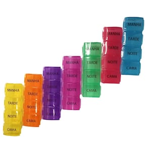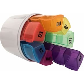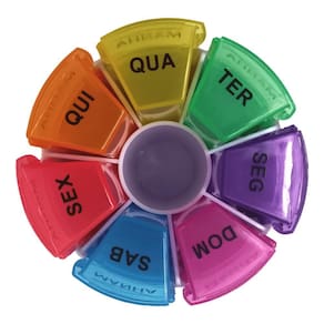 Características gerais: :: auxiliar na organização de medicamentos e vitaminas; :: material resistente e colorido; ::7 bandejas, uma para cada dia da semana. Cada bandeja é ainda subdividida para medicação em 4 períodos distintos: manhã, tarde, noite, cama.