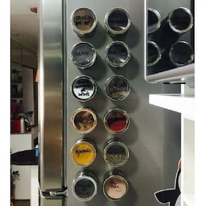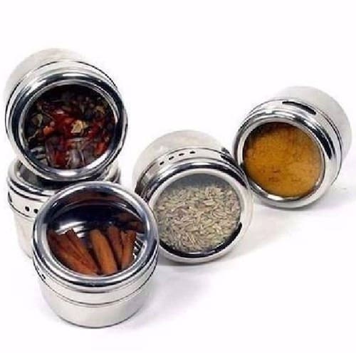 Porta Condimentos Magnético com 6 unidades Acompanha de base para fixação sendo que a mesma está com ponta de solda. Dimensões: 15x19cm / Frascos: 4,5x6,5cm Material: Aço inox Podem ser fixados em geladeiras, freezers, fornos e microondas Aço inoxidável escovado, imã e suporte metálico Não deixa cheiro nem gosto Visor de acrílico Cavidades diferenciadas para permitir a saída do tempero Completamente desmontável para limpeza Vedação completa sem vazamentos Lavável na lavalouças