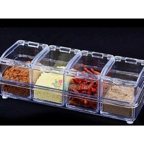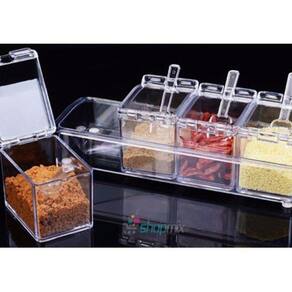 Características: - Cor: Potinho transparente; - Material: Acrílico; - O organizador de temperos possui 4 potinhos independentes para o armazenamento do condimento; - Possui 4 colheres para facilitar o uso dos potes, você não precisa ficar lavando sempre que for pegar um tempero diferente, pois cada pote tem sua colher dependente; - Possui pé de encaixe que aumentam a sua aderência; - Potinhos podem ser retirados da base caso queira organiza los ou até mesmo lava-los de forma independente; - Produto totalmente portátil;