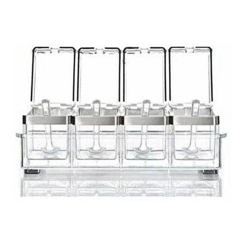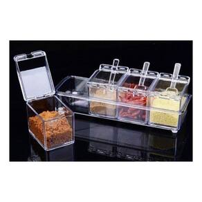 Porta Condimentos E Temperos Crystal Seasoning Box P/entrega Cor: Transparente A caixa contém quatro recipientes de plástico destacáveis colocados em uma bandeja. Os compartimentos destacáveis são feitos com tampas de tipo prensa e equipadas com colheres. Os compartimentos de armazenamento também podem ser usados para armazenar outras especiarias / ingredientes como você preferir. Fácil de procurar esses ingredientes escondidos. Muito útil para uso na sua cozinha.