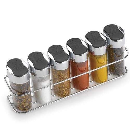 Porta condimentos de parede Material aço cromado, não enferruja Pode ser fixado na parede com parafusos Tamanho do suporte: C.23,8cm X L.13,5cm X A.8cm Potes em acrílico cristal Tamanho do pote: C.4,5cm X L.3,5cm X A.10cm Incluso 6 potes Ean: 7897807453060