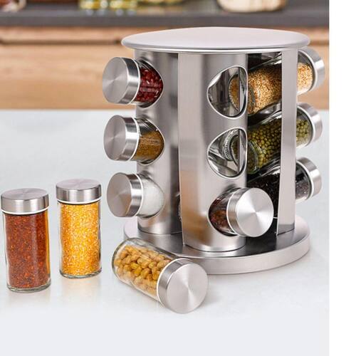 Características: - Porta condimentos com suporte giratório - Material: vidro e aço inox - 12 potes de 80g cada - Design moderno e ergonômico - Fácil de instalar e usar - Otimiza espaço de maneira eficiente - Mantém os temperos corretamente armazenados - Base giratória permite visualizar todos os temperos com um simples giro