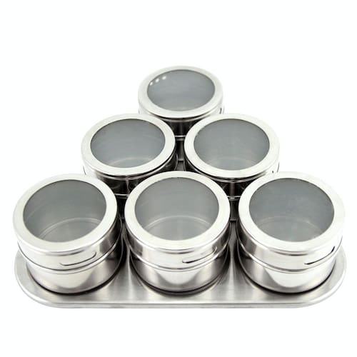 Porta Condimentos Magnético 6 Peças-Clink DESCRIÇÃO - Modernos e bonitos, os porta condimentos podem ser fixados em geladeiras, freezers, fornos e microondas, dispondo seus temperos com muito estilo e de forma extremamente prática. - Fixe em qualquer superfície metálica da sua cozinha CARACTERÍSTICAS - Aço inoxidável escovado, imã e suporte metálico. - Não deixa cheiro nem gosto. - Visor de acrílico. - Cavidades diferenciadas para permitir a saída do tempero. - Completamente desmontável para limpeza. - Vedação completa sem vazamentos. - Material: Aço Inox. - Cor: Metálico. DIMENSÕES: - Frascos: 4,5x6,5 cm. ITENS INCLUSOS - 4 Frascos Porta Condimentos Magnético Vantegens: Podem ser fixados em geladeiras, freezers, fornos e micro-ondas - Aço inoxidável escovado, imã e suporte metálico - Não deixa cheiro nem gosto - Visor de acrílico - Cavidades diferenciadas para permitir a saída do tempero - Completamente desmontável para limpeza - Vedação completa sem vazamentos - Lavável na lava-louças