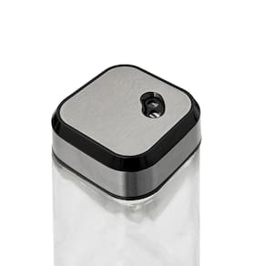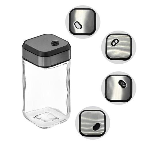 Porta condimentos da marca Quanhe, fabricado em vidro e aço inox, indicado para armazenar sal, palitos e temperos variados. Possui tampa giratória com opções de abertura para controle da dosagem. Produto compacto para uso prático e organizado na cozinha.