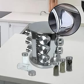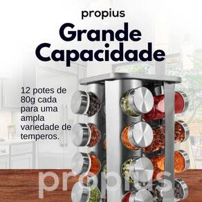 - Material: Aço Inox e Vidro - Base giratória - 12 potes com capacidade de 80 gramas cada - Dimensões Gerais: 22cm Altura x 18cm Largura x 18cm Profundidade - Dimensões do Pote: 9,5cm Altura x 4cm Diâmetro - Peso Total: 2.300 Kg - Tamanho da Embalagem: 23x19x19cm