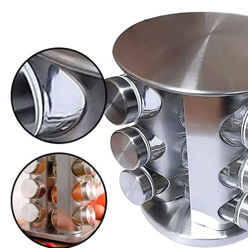 - Material: Aço Inox e Vidro - Base giratória - 12 potes com capacidade de 80 gramas cada - Dimensões Gerais: 22cm Altura x 18cm Largura x 18cm Profundidade - Dimensões do Pote: 9,5cm Altura x 4cm Diâmetro - Peso Total: 2.300 Kg - Tamanho da Embalagem: 23x19x19cm