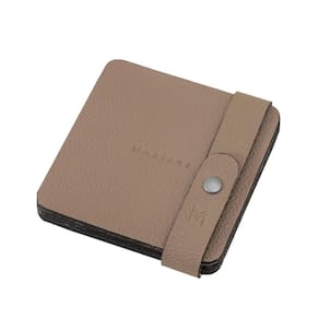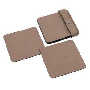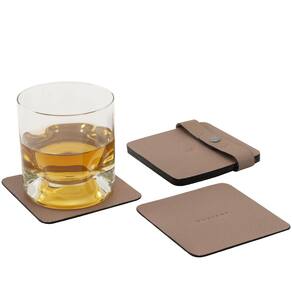 Estrutura do corpo: Construção em couro de espessura média e toque macio. Logomarca em relevo. Dimensões: 9,5 x 9,5 cm largura x altura Haste com fechamento em botão para agrupar os porta-copos. Contém 6 unidades. Peso aproximado: 40 gramas Material: couro