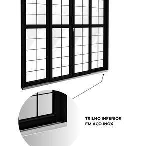 A grade quadrada confere identidade moderna e proteção, enquanto o vidro liso de 4cm garante a entrada de luz natural e sensação de amplitude.Produzida em aço com pintura eletrostática a pó, assegura acabamento uniforme e alta durabilidade. O trilho em aço inox proporciona deslizamento suave, o puxador em alumínio harmoniza o conjunto, e a fechadura com chave tetra reforça a segurança.