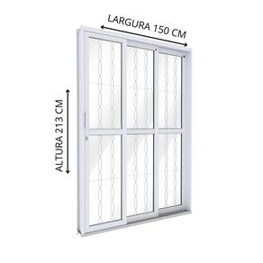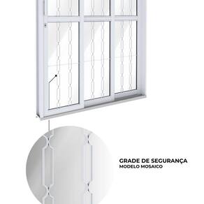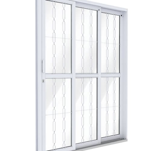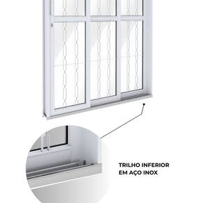 Possui duas folhas móveis e uma fixa, com grade mosaico que valoriza o visual do ambiente sem abrir mão da proteção. O vidro liso de 0,4cm permite ampla entrada de luz natural, garantindo leveza e conforto visual.