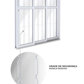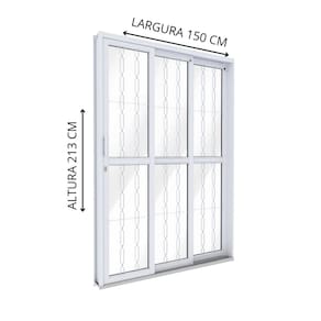 Possui duas folhas móveis e uma fixa, com grade mosaico que valoriza o visual do ambiente sem abrir mão da proteção. O vidro liso de 0,4cm permite ampla entrada de luz natural, garantindo leveza e conforto visual.