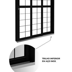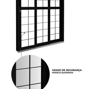 Possui duas folhas móveis e uma fixa, com grade quadrada que valoriza o visual do ambiente sem abrir mão da proteção. O vidro liso de 4cm permite ampla entrada de luz natural, garantindo leveza e conforto visual.