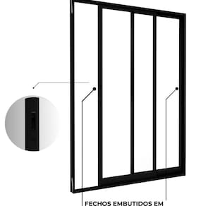 Os fechos embutidos e o trilho são em alumínio, na cor do produto, garantindo um visual harmonioso e funcional.