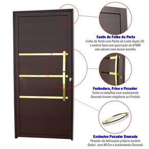 Apresentamos a nossa Porta de Alumínio da Linha Super 25, com uma elegante pintura eletrostática na cor preta. Esta porta é composta por uma única folha que abre para o lado direito, oferecendo um design prático e sofisticado. Os lambris dispostos horizontalmente, juntamente com três frisos polidos, dourados e envernizados, adicionam um toque de luxo à porta. O puxador Dubai de 80 cm, polido e dourado, complementa perfeitamente o design da porta, conferindo-lhe um aspecto harmonioso. Com uma altura de 210 cm e uma largura de 100 cm, e um requadro de 4,6 cm, esta porta é uma opção robusta e imponente para a sua entrada. Para a sua tranquilidade, oferecemos uma garantia de 5 anos contra defeitos de fabricação, garantindo a sua satisfação com o nosso produto.