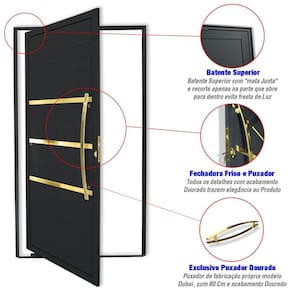 Apresentamos a nossa Porta Pivotante de Alumínio da Linha Super 25, com uma distinta pintura eletrostática na cor preta. Esta porta é composta por uma única folha que abre para o lado direito, oferecendo um design elegante e funcional. Os lambris dispostos horizontalmente, juntamente com três frisos polidos, dourados e envernizados, adicionam um toque de sofisticação à porta. O puxador Dubai de 80 cm, polido e dourado, complementa perfeitamente o design da porta, conferindo-lhe um aspecto harmonioso. Com uma altura de 210 cm e uma largura de 100 cm, e um requadro de 4,6 cm, esta porta é uma opção robusta e imponente para a sua entrada. Para a sua tranquilidade, oferecemos uma garantia de 5 anos contra defeitos de fabricação, garantindo a sua satisfação com o nosso produto.