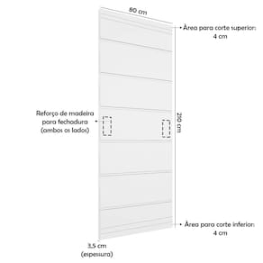 Informações Complementares: Folha de Porta, Produto não acompanha Batente, fechadura, dobradiças e guarnição.Folha de Porta de Madeira Frisada tem o requadro em madeira de reflorestamento e reforço em madeira bilateral centralizado para colocação de fechadura. O enchimento é feito com colméia Honeycomb, produzido com papel semi-kraft com 160 folhas, o que confere maior resistência após a colagem da chapa de acabamento (Duratex).
