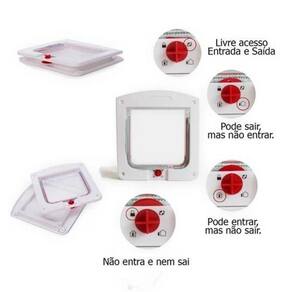 Porta De Passagem Para Pet Cães Pequeno Porte e Gatos A porta de passagem permite que o pet circule sem impedimento pelos ambientes internos ou externos da casa. Pode ser Utilizado tanto por gatos quanto cães de pequeno porte até aprox. 8kg . Ela deixa o pet mais independente, pois ele pode sair para o quintal para brincar, usar a caixa sanitária ou tapete higiênico em outros ambientes dentro de casa. Outro ponto positivo é que, portas onde elas são instaladas não costumam ser arranhadas, pois o animal não precisa pedir para sair ou entrar. A porta de passagem pode ser instalada em portas ou paredes de qualquer material, que tenham entre 2,5cm até 5cm de espessura. Acompanha kit para instalação. 4 FORMAS DE ACESSO: Totalmente fechada; Totalmente liberada; Liberada somente para entrada; Liberada somente para saída. ESPECIFICAÇÕES TÉCNICAS: Cor: Branca; Material: Polipropileno; Medida Externa: Alt. 22,5cm Larg. 20cm; Medida Interna: Alt. 14,5cm Larg. 15,5cm; Peso Aproximado: 285 gramas. ATENÇÃO: Como medir meu pet para saber se essa porta possui tamanho adequado para ele Medir a parte mais larga de seu cão ou gato peito ou quadril e adicione mais 2 ou 3cm, para saber a largura total necessária para ele passar. Medir a parte debaixo do peito até a parte mais alta do ombro acrescentando mais 2 ou 3 cm, para saber a altura total necessária para ele passar. ITENS INCLUSOS: 01 Porta passagem; 01 Kit instalação.