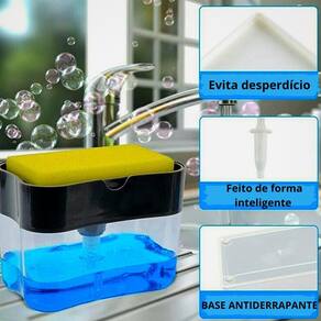 Porta Detergente e Esponja Bucha Suporte Sabão Pia Cozinha Dispense de detergente 2 em 1 Lave a louça mais rapidamente com o dispensador de detergente por pressão. Fácil e rápido de usar: apenas encha o reservatório com detergente e pressione para que ele saia diretamente na esponja.Conveniente e muito mais elegante que potes de detergente.Economia: é possível adicionar água ao reservatório para diluição do detergente e aproveitá-lo por mais tempo. Boa capacidade do reservatório: cabe até 385ml do líquido de uma só vez. Dura semanas até precisar preencher novamente Evite consumir mais detergente que o necessário, com o dispense de detergente 2 em 1 você economiza muito mais e o seu bolso agradece. O produto evita o desperdício de detergente, pois possui dosador que funciona por pressão, e mantém a esponja seca para futuras utilizações. É simples de utilizar e de limpar Marca: Dratini