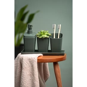 PRATICIDADE: O porta-escova Flora possui espaço para até 2 escovas e pasta dental. Dimensões: 8,2 x 8,2 x 12,3 cm (CxLxA). MATERIAL ECOLOGICAMENTE RESPONSÁVEL: 100% produzido com plástico pós-consumo, isso é, proveniente de resíduos coletados. É durável e resistente. ACABAMENTO CANELADO COM TOQUE SUAVE: O produto tem textura acetinada com o corpo em acabamento canelado, traz a sensação de movimento, leveza e conforto. O padrão canelado proporciona sofisticação e composição de texturas para o ambiente em que estiver. FÁCIL MANUTENÇÃO: Com um pano úmido e álcool, o seu porta-escova fica novinho! NÃO QUEBRA: prático para ser utilizada na bancada do banheiro. LINHA FLORA: a linha da Coza que é feita com material proveniente de resíduos coletados e transformados novamente em produtos. Os produtos que fazem parte são: cestas organizadoras, utensílios para bancada do banheiro, lixeiras, utensílios para pia, entre outros. SUSTENTABILIDADE: A marca Coza preocupa-se com o meio ambiente e por isso, possui esta linha com o propósito de propiciar um segundo uso para resíduos que seriam descartados.