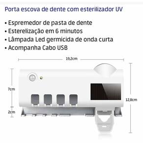 Porta escova de dentes pasta automatico e esterilizador uv vantagens em comprar em nossa loja - empresa autorizada. - despachamos em até 24 horas. - mercadorias muito bem embaladas para não correr o risco de . - compra 100% segura. ======= porta escova de dentes ======= porta escova de dentes suporte de pasta automático e esterilizador uv o porta escova de dentes solar possui uma tecnologia avançada, contendo o raio ultravioleta e fotocatalisador que agiliza a esterilização eletrônica, matando 99,9% das bactérias e microorganismos que causam danos nas escovas de dente e na saúde bucal. A bomba de vácuo libera o creme dental em uma quantidade adequada, evitando desperdício. O dispenser tem um sistema de carregamento solar e iluminação doméstica, não sendo necessário plugues e baterias para substituir, o que garante segurança e economia. ======= especificações técnica ======= medidas: largura 19,2 cm x comprimento 5 cm x altura 13,5 cm material: abs entrada: bivolt 100-240 v 50/60 hz o produto contém: 1 suporte com esterilizador uv; 1 adaptador para tubo de pasta de dente; 1 kit de fixação; 1 cabo usb. Dicas: 1 dica: use usb para carregar por 6 horas antes do primeiro uso; 2 dica: faça uma marcação na sua parede antes de instalar o produto para uma melhor visualização do local; 3 dica: para instalar basta remover a fita dupla-face, pressionar 3 vezes, e colocar o selante em torno dele; 4 dica: sem necessidade de ativação manual, o sensor infravermelho inteligente ativa quando uma pessoa se aproxima e começa a esterilizar depois de sair. Se o dispenser fica dentro do banheiro, como a luz solar recarrega o produto ele pode ser carregado também pela iluminação doméstica. Para que serve o botão do lado esquerdo ele serve como um sensor infravermelho, ativa quando uma pessoa se aproxima e começa a esterilizar depois de sair. É 220v ou 110v ele é bivolt. Essa luz uv pode fazer algum mal ao usuário com o tempo de uso não faz mal nenhum, ela fica somente na escova para matar as bactérias. O cabo usb pode ser ligado diretamente na tomada ou só no computador para a primeira utilização, é necessário realizar o carregamento do dispenser na tomada por 6h. As pastas são médias ou também podem usar as grandes pode ser utilizado qualquer tipo de pasta de dente. Marca: Porta Escova De Dentes