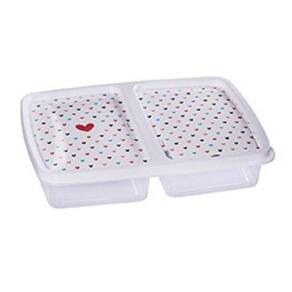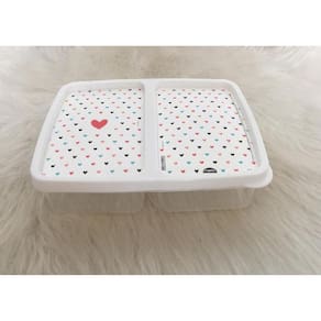Este pote retangular possui 2 divisórias para separação de alimentos. É produzido em plástico atóxico, livre de bpa. Pode ser levado ao freezer e ao microondas. Possui decoração com tecnologia intra imagem. Dimensões do produto: Comprimento: 24 cm x Largura: 17 cm x Altura: 5 cm.