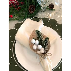Porta Guardanapo de Natal Rústico Azevinho Branco, artesanal com Flor Permanente e Argola de Madeira Cerejeira.