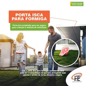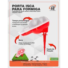 Porta Isca Para Acabar Com A Formiga Doceira Cortadeiras Nosso modelo de porta iscas para formigas cortadeiras é fixado no jardim através de uma haste plástica, resistente à chuva, vento... Pois é fabricado com um plástico resistente que não quebra fácil e não entra água no compartimento. Ele possui uma capa que protege as iscas contra a poeira ,umidade e da luz direta do sol, ventos e chuva, aumentando a durabilidade da isca e sua eficácia. Possui um ótimo custo, nossos clientes têm uma ótima margem de lucro, e resultados desde o primeiro uso. Somos uma empresa consolidada no ramo de injeção plástica, e que conta com várias linhas nesse segmento. Nossos produtos são 100% brasileiros. FUNCIONAMENTO - A porta iscas para formigas é um dispositivo prático e eficiente projetado para combater e controlar infestações de formigas em ambientes externos. Essa solução é uma forma segura e inteligente de atrair as formigas, permitindo o controle e a erradicação da colônia. - Projetada para manter a isca protegida e fora do alcance de animais de estimação e crianças. Ela possui aberturas que permitem que as formigas acessem o interior da estação, mas a sua construção impede que outros animais maiores possam alcançar o . - O funcionamento é bastante simples: as formigas que encontram a porta iscas para formiga são atraídas pelo odor e sabor atrativo da isca colocada em seu interior. Elas entram na estação, coletam o e levam-no de volta para o formigueiro, onde compartilham com outras formigas e a rainha. Dessa forma, o é disseminado pela colônia, afetando as formigas operárias e, eventualmente, enfraquecendo e eliminando toda a colônia. - A grande vantagem desse método é que ele ataca a origem do problema, eliminando toda a colônia, em vez de simplesmente afastar as formigas temporariamente. - Tampa prova dágua - Haste de fixação - Copo de armazenamento, capacidade para 50g de isca granulada. Marca: Não Informado Ean: 0618341931787